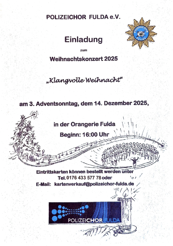 Polizeichor Fulda e.V.Polizeipräsidium OsthessenSeveringstr. 1- 936041 FuldaTel.: +49 151 17898908