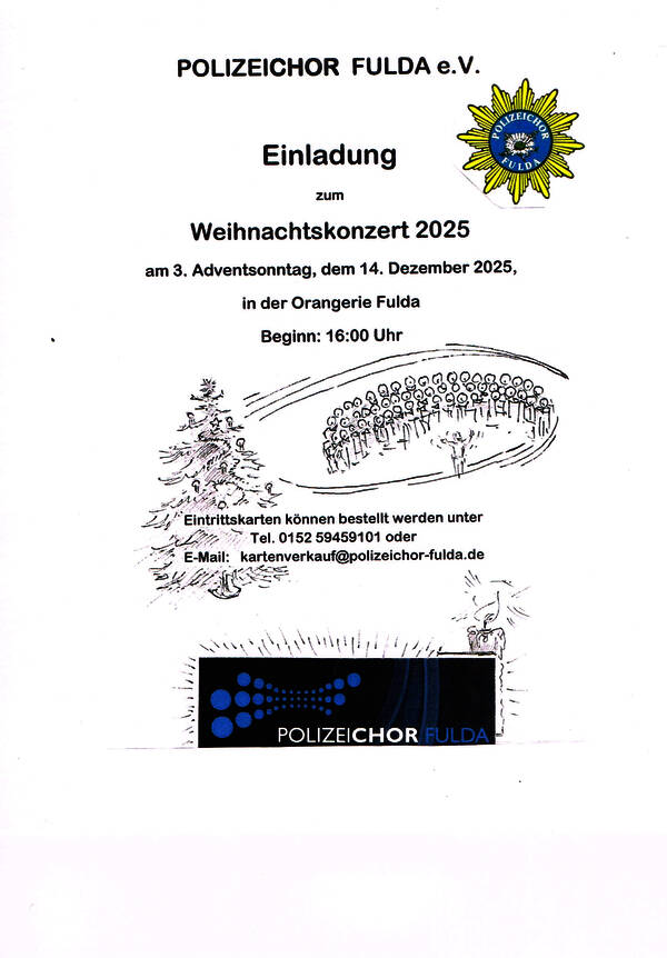 Polizeichor Fulda e.V.Polizeipräsidium OsthessenSeveringstr. 1- 936041 FuldaTel.: +49 151 17898908